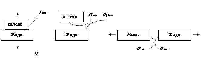 Это уравнение можно объяснить так: работа адгезии определяется той работой, которую необходимо затратить для отрыва жидкости от твердой поверхности. При контакте жидкости с твердой поверхностью удельная свободная поверхностная энергия (поверхностное натяжение) равняется γжт, а после разъединения становится (