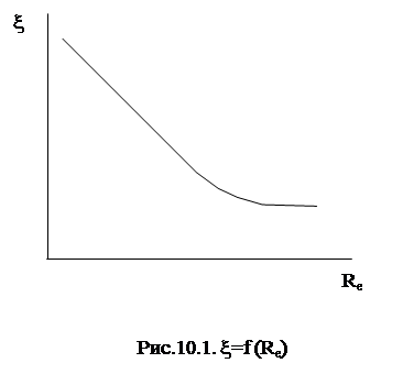 Характер зависимости коэффициента сопротивления x от числа Рейнольдса Re – кривая (рис.10.1.). Однако для частиц малого размера справедлив линейный закон сопротивления, соответствующий левому участку линии, т.е. сила сопротивления для частиц малого размера пропорциональна первой степени скорости осаждения частицы.