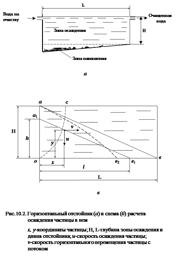 Рассмотрим характер движения воды и частиц взвеси в зоне осаждения горизонтального отстойника (рис.10.2., б).
