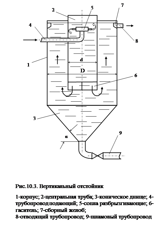 Вертикальный отстойник (рис.10.3.) представляет собой круглый или квадратный корпус 1 с центральной трубой 2 и коническим днищем 3. Вода на очистку подается в центральную трубу по трубопроводу 4, разбрызгивается через сопла 5, идет сверху вниз по центральной трубе и через гаситель 6 поступает в нижнюю часть отстойника и движется снизу вверх. Осветленная вода переливается в сборные желобы 7, кольцевые или радиальные, и отводится по трубопроводу 8, а осадок собирается в нижней конической части отстойника, откуда непрерывно или периодически удаляется через шламовый трубопровод 9.