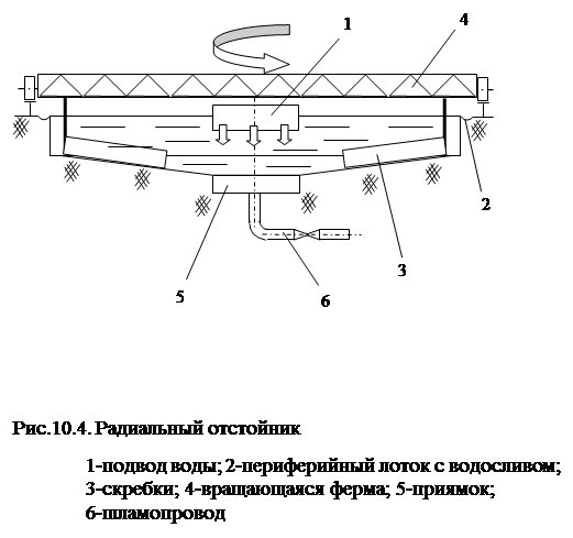 Подвод воды к радиальному отстойнику осуществляется в центре через специальные распределительные устройства в виде цилиндра с отверстиями. Вода, движущаяся по радиусу, собирается в периферийный лоток, оборудованный по всему периметру водосливом, и отводится за пределы отстойника. Осадок удаляется механически с помощью скребков, укрепленных на вращающейся ферме. Скребки сгребают осадок в приямок, расположенный в центральной части отстойника, откуда он удаляется по трубам при помощи шламовых насосов.