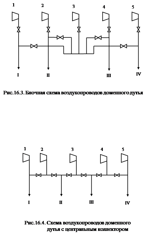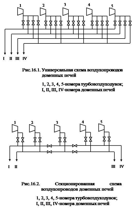 На большинстве металлургических заводов воздухопроводы проложены по универсальной схеме (рис.16.1.), позволяющей подключать воздуходувную машину к любой из доменных печей. Основной недостаток этой схемы – большое количество коллекторов и арматуры, что удорожает сеть и снижает ее надежность.