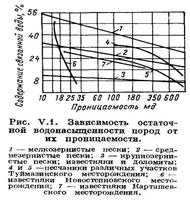 Приведенные кривые не универсальны. Для пород с иной структурой пор и содержащих другие количества глинистого материала зависимость остаточной водонасыщенности от проницаемости может количественно отличаться от приведенных. Однако характер зависимости в большинстве случаев тот же – с увеличением проницаемости количество остаточной воды в породе уменьшается.