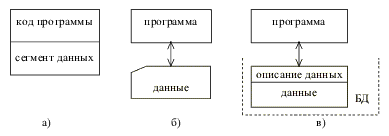 На заре развития вычислительной техники обрабатываемые данные являлись частью программ: они располагались сразу за кодом программы в так называемом сегменте данных (рис. 1.1,а). Следующим шагом стало хранение данных в отдельных файлах (рис. 1.1,б). Недостатком этих двух подходов являлась зависимость программ от данных: сведения о структуре данных включались в код программы. При изменении структуры данных необходимо было вносить изменения в программу.