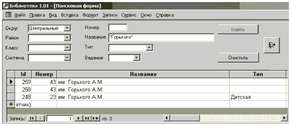 Информационный язык ИПС предназначен для того, чтобы пользова-тель мог запросить данные у системы. Системными средствами пользовательский запрос преобразуется в формальный запрос, понятный системе. Информационный язык ИПС может быть основан на подмножестве естественного языка, которое относится к обслуживаемой ПО. Но чаще поиск документа осуществляется с помощью шаблонов – экранных форм, включающих поля описания документа. В эти поля вносятся конкретные значения, которые и определяют условия поиска документов. На рис. 1.2 приведён пример поиска через экранную форму в справочнике библиотек. В форме указаны два условия – округ и фрагмент названия библиотеки, и в результате поиска система выдала три записи, удовлетворяющие этим условиям.