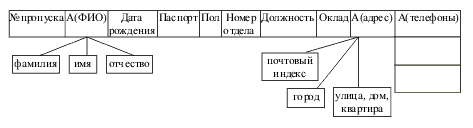 Эта запись имеет несколько элементов данных (Номер пропуска, Должность, Пол и т.д.) и три агрегата: простые агрегаты ФИО и Адрес и повторяющийся агрегат Телефоны. (Повторяющийся агрегат может включаться в запись произвольное число раз).