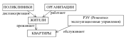 Здесь запись типа ПОЛИКЛИНИКА является владельцем записей типа ЖИТЕЛЬ и они связаны групповым отношением диспансеризация. Запись типа ОРГАНИЗАЦИЯ также является владельцем записей типа ЖИТЕЛЬ и они связаны групповым отношением работают. Записи типа РЭУ и типа ЖИТЕЛЬ являются владельцами записей типа КВАРТИРА с отношениями соответственно обслуживают и проживают. Таким образом, запись одного и того же типа может быть членом одного отношения и владельцем другого.