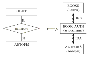 - Бинарная связь типа n:m реализуется с помощью промежуточной таблицы. Например, для сущностей КНИГИ и АВТОРЫ и связи написать промежуточная таблица будет содержать два внешних ключа: идентификатор книги и идентификатор автора, написавшего эту книгу (рис. 8.6). В эту промежуточную таблицу также вносятся те атрибуты, которые характеризуют эту связь (например, номер автора в списке авторов этой книги).