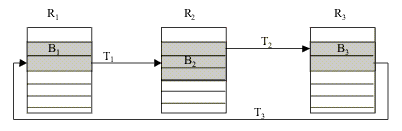 Тупиковые ситуации (deadlocks) возникают при взаимных блоки-ровках транзакций, которые выполняются на пересекающихся множествах данных (рис. 5.3). Здесь приведён пример взаимной блокировки трех транзакций Ti на отношениях Rj. Транзакция T1 заблокировала данные B1 в от-ношении R1 и ждёт освобождения данных B2 в отношении R2, которые заблокированы транзакцией T2, ожидающей освобождения данных B3 в отношении R3, заблокированных транзакцией T3, которая не может продолжить выполнение из-за транзакции T1. Если не предпринимать никаких дополнительных действий, то эти транзакции никогда не завершатся, т.к. они вечно будут ждать друг друга.