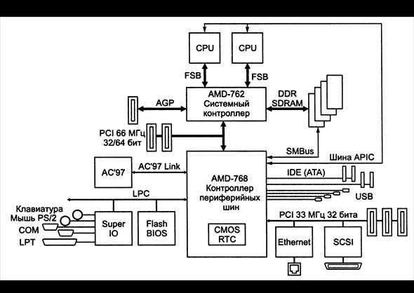 В качестве мощного представителя шинно-мостовой архитектуры можно рассматривать чипсет AMD-760 (рис.4.1). Здесь имеются первичная шина PCI на 64 бит и 66 МГц, являющаяся «экватором», и вторичная шина для подключения рядовой периферии.