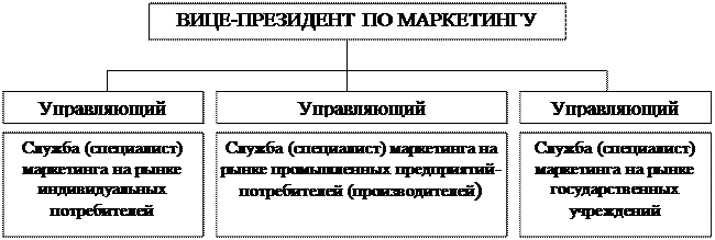 В зависимости от специфики рынка, в оргструктуре могут быть выделены подразделения, ориентированные на конкретных потребителей (например на рынок женской, мужской и детской одежды) на предприятия, являющиеся потребителями (рынок машиностроительных, строительных и других предприятий). В таких рыночных структурах осуществляются все необходимые функции маркетинга.