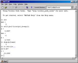 Работа в среде MATLAB может осуществляться либо в программном режиме, либо в командном режиме (режиме калькулятора, диалоговом режиме) по правилу «задал вопрос, получил ответ». Это превращает MATLAB в необычайно мощный калькулятор, который способен производить не только обычные для калькулятора вычисления, но и операции с векторами и матрицами, комплексными числами, рядами и полиномами. Можно почти мгновенно задать и вывести графики различных функций: от простой синусоиды до сложной трехмерной фигуры.