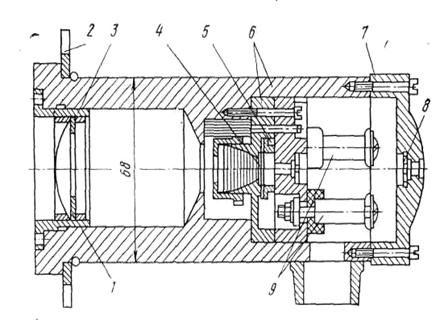 1 – линза; 2 – установочный фланец; 3 – сменная втулка; 4 – термобатарея; 5 – компенсационная катушка; 6 – камера термобатареи; 7 – крышка; 8 – отверстие для наблюдения; 9 – ввод проводов