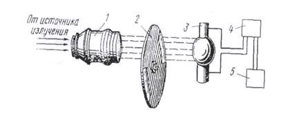 1 – оптическая схема; 2 – диск со светофильтрами; 3 – фотоэлемент; 4 – блок измерения; 5 - самописец