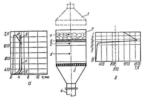 На рис 5.1, а показано изменение температуры, зафиксированное через 4 мин после начала спекания термопарами a,b,c,d, заложенными в шихту на указанных отметках. Показания термопары «а» свидетельствуют о том, что к данному моменту времени в 1 слое происходит охлаждение. При этом в верхней половине слоя уже сформировался агломерат, а в нижней идет кристаллизация расплава. По данным термопары «b» в зоне горения температура достигла максимума; термопара с фиксирует, что в 4 слое шихта интенсивно нагревается. Термопара d, находящаяся еще на значительном расстоянии от зоны горения, показывает лишь небольшой подъем температуры.