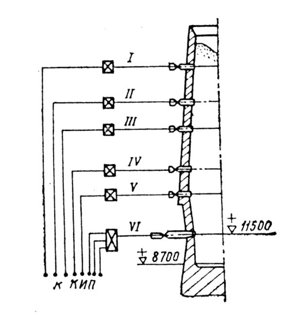 I, II, III, IV, V, VI – уровни опытных рабочих площадок с отверстиями в шахте печи; +8700 – уровень рабочей площадки; +11500 – ось воздушных фурм