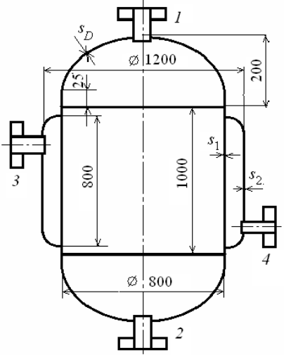 Примем, что аппарат изготовлен автоматической сваркой под слоем флюса, поэтому j=1. Коррозионная проницаемость применяемого материала менее 1 мм в год, поэтому прибавка на коррозию и эрозию составит 1 мм. Все размеры приведены на рис.1.