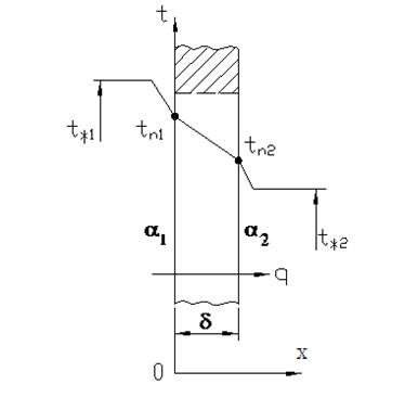 Рис. 1.7 Теплопередача через плоскую стенку