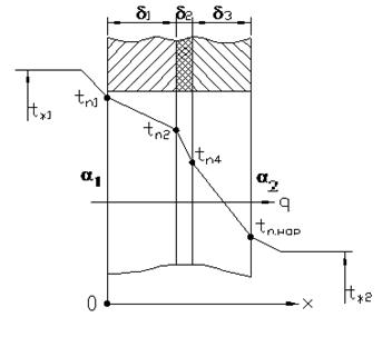Рис. 1.8 Теплопередача через плоскую многослойную стенку