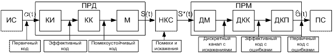 Сообщение, поступающее от источника ИС, в некоторых случаях содержит избыточность, обусловленную статистической связью символов. В ряде случаев избыточность источника играет положительную роль, например, в телеграфии при исправлении части искаженных слов в телеграмме. Однако, из-за наличия избыточности уменьшается скорость передачи информации, поэтому один из путей повышения скорости передачи информации связан с устранением избыточности источника. Задачу устранения избыточности на передаче в системе ПДС выполняет кодер источника КИ, а восстановление принятого сообщения – декодер получателя ДКП. Часто КИ и ДКП включаются в состав ИС и ПС. Один из способов устранения избыточности связан с применением эффективного (экономного) кодирования, основы которого рассматриваются в 3.1.