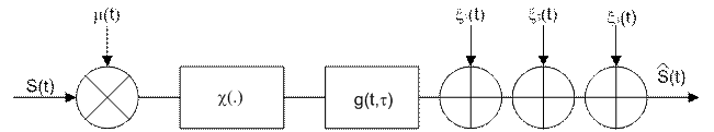 Более полная модель должна учитывать другие типы аддитивных помех, нелинейные искажения сигнала, а также мультипликативные помехи. Такая модель непрерывного канала представлена на рис.2.2. Здесь c(×) – амплитудная характеристика безынерционного нелинейного четырехполюсника, моделирующего нелинейные преобразования сигнала в канале; µ(t) - мультипликативная помеха, которая перемножается с полезным сигналом; x1(t) - аддитивные гауссовские шумы, x2(t) – аддитивные импульсные помехи; x3(t) – аддитивные сосредоточенные помехи.