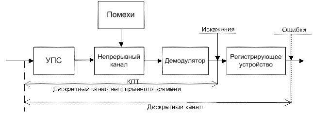 В системе ПДС иногда выделяют дискретный канал непрерывного времени (рис. 2.3). Если на выходе дискретного (или строго дискретного) канала имеется сигнал, описываемый дискретной функцией дискретного времени, то выходе дискретного канала непрерывного времени сигнал описывается дискретной функцией непрерывного времени. Часто дискретный канал непрерывного времени называют каналом постоянного тока (КПТ), так как на его выходе сигналы имеют форму импульсов постоянного тока (ИПТ).