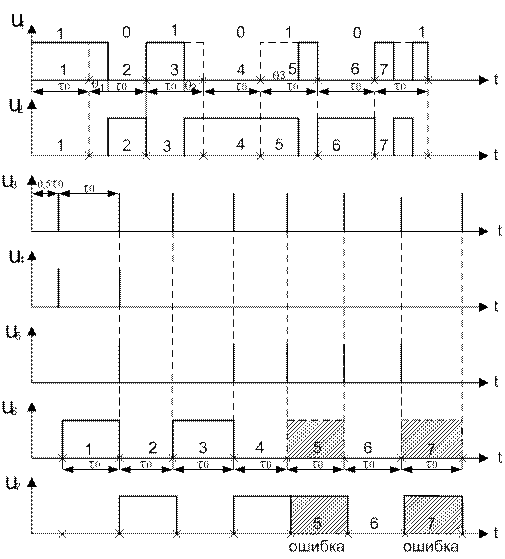 Логические элементы D1 – D3 предназначены для определения значащих позиций единичных элементов, а триггер D4 – для восстановления единичного интервала t0. Регистрация значений единичных элементов строго в середине t0 обеспечивается системой тактовой синхронизации.