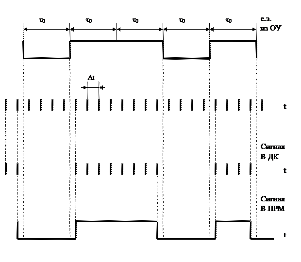 Метод наложения состоит в том, что состояние каждого е.э. последовательности, поступающей от ОУ, опробуется (стробируется) импульсами распределителя синхронного ДК. Стробирующие импульсы следуют с частотой дискретизации fд . Расстояние между импульсами дискретизации обозначим через Δt. Результаты опробывания передаются в ДК. На приёме по огибающей принятой последовательности восстанавливается исходный сигнал (см. рис. 3.2.).