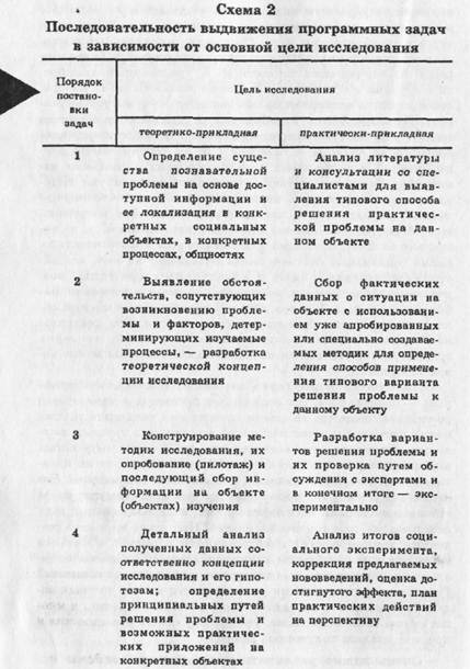 Теоретико-прикладное исследование, если оно переходит в стадию практически-прикладного, после решения 4-й задачи развивается по схеме последнего (решение задач 2-4 во второй колонке). Практически-прикладное исследование, если не находится типового способа решения социальной проблемы на данном объекте (1-я задача), вначале осуществляется по схеме теоретико-прикладного и только затем переходит в фазу "социально-инженерного".