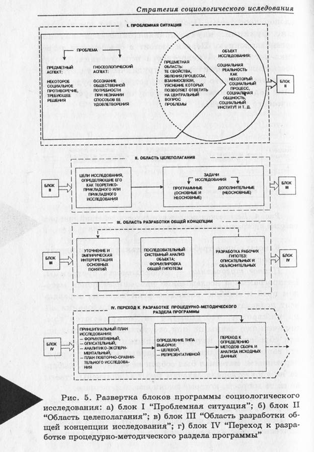 Составление программы — необходимое условие успешности всей работы. На рис. 4 показана принципиальная последовательность действий социолога в процессе разработки программы, а на рис. 5 — развертка блоков программы. Программа выполняет две важнейшие функции: научно-познавательную и научно-организационную. Первая состоит в обеспечении теоретико-методической целостности исследования, вторая обеспечивает эффективное сотрудничество участников исследовательского коллектива, разделение труда между ними ради достижения общего научного и научно-практического результата.