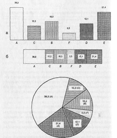 Рис. 6. Виды диаграмм распределения качественных признаков в номинальной неупорядоченной шкале: а — столбиковая диаграмма; 6 — ленточная диаграмма; в — секторная диаграмма; А, В, С, D и т. д.— отдельные качественные признаки, например, профессионально-квалификационные группы работников, отношение к политическим партиям и т. д.
