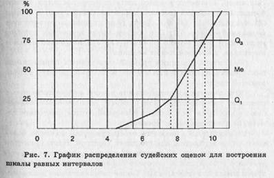 Анализ распределения судейских оценок производится путем исчисления медианы и отклонений от медианной точки.