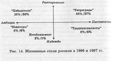Пропорция социально уверенных сократилась: "традиционалистов" — с 8% в 1996 г. до 5% в 1997г., "новаторов" — с 8% до 6% и тип "истэблишмент" с 2% до 1%.
