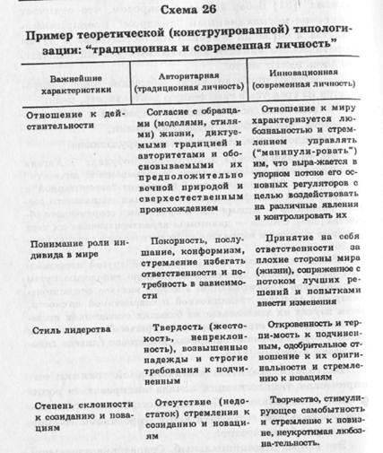 Эта типологическая конструкция побудила Э. Хагена сконструировать идеальные типы "инновационной личности" в отличие от "традиционалиста" (личности "авторитарной"). Авторитарный тип сформирован в условиях социального застоя, инноватор — динамичными процессами современного общества [336]. Отсюда — дихотомия характеризующих их черт (которые логически выводятся из теоретического анализа (схема 26).