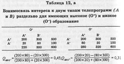 Пример 2. Обозначим Пр профессию телезрителей (Пр и Пр2 — это две группы профессий). И+ наличие, И~ отсутствие интереса к определенным программам. Для таблицы 11» используя те же данные, что в табл. 10, связь равняется 0,82 по коэффициенту ассоциации Юла (Qnp.K= 0,82).