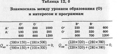 Между интересом к передачам "Что, где, когда?" и "В мире животных" есть незначительная связь в пользу второй (Q=-0,20). Введем контрольную — образование (Табл. 12, а)