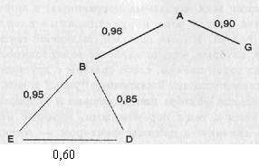 Иная связь между вершинами В, D и Е. Все они взаимодействуют на уровне R более 0,60. Но каждая из них связана с вершиной С очень слабо (от 0,02 до 0,14, в графе эти связи опущены). В является промежуточной между А, с одной стороны, Е и D — с другой, так как связи ЕсА гораздо слабее, чем их связи с В, которая, в свою очередь, тесно связана с А