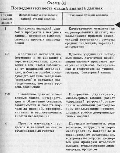 Цель исследования определяет уровень анализа в том смысле, что либо позволяет, либо запрещает прекратить его на какой-то стадии. В полном же объеме, т. е. от первого до последнего шага, последовательность действий социолога при анализе эмпирических данных может быть представлена следующим образом.