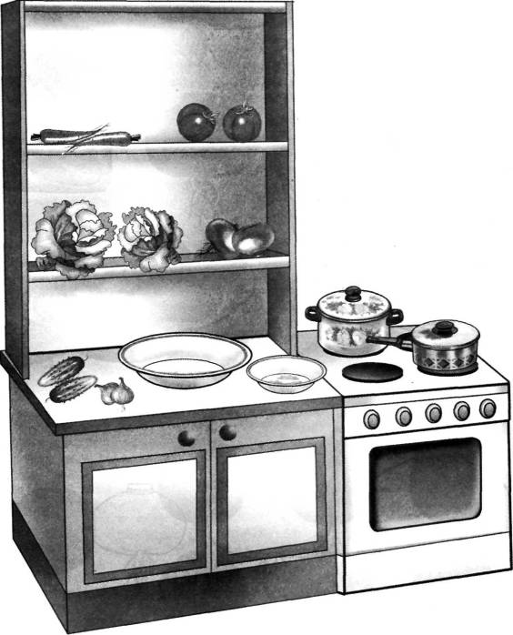 3. Развитие лексики и грамматики. Предложите ребенку рассмотреть сюжетную картинку «На кухне». Расскажите, что повару нужно приготовить обед из овощей и надо ему помочь. Предложите ребенку, глядя на картинку, перечислить, из каких овощей повар будет готовить обед. (Из капусты, из репки, из помидоров, из огурцов, из лука, из моркови.)