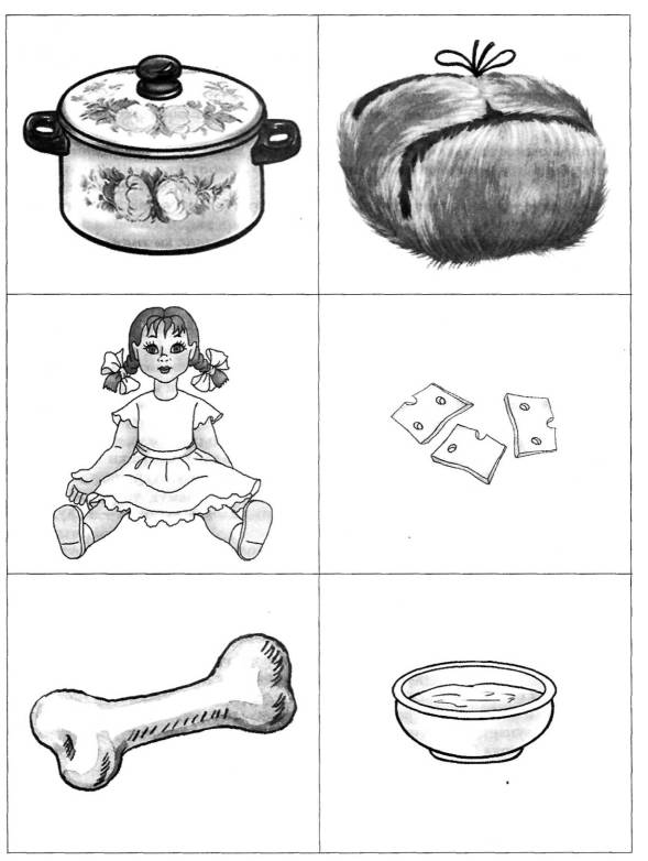 6. Развитие мышления. Скажите ребенку, что дедушка, бабушка, внучка, собачка, кошка и мышка пригласили его в гости. В гости ходят с подарками. Покажите ребенку предметные картинки (см. с. 41): кастрюля, шапка, молоко, косточка, кукла, сыр. Попросите ребенка правильно раздать подарки. Задайте ему вопросы.