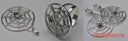 Также очень необычно смотрятся серьги в виде паутинки в сочетании с подвеской и браслетом в таком же стиле.