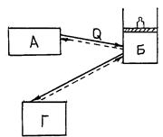 | В ТДС входят (рис.1): источник тепла А, могущий получать или отдавать энергию в виде тепла; рабочее тело Б, преобразующее тепло в работу или наоборот; тело Г, могущее отдавать или аккумулировать работу. Рабочее тело совершает преобразование тепла в работу или обратно. Рабочее тело – движущаяся материальная среда (жидкая или газообразная) играет роль посредника в процессах взаимопревращения тепла и работы. |