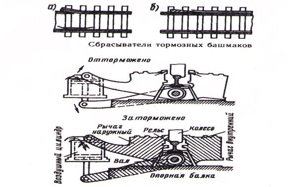 Наиболее совершенные средства торможения – вагонные замедлители. Принцип их действия – захват бандажей шинами, выступающими над головками рельсов с обеих сторон колеса. Существует несколько конструкций вагонных замедлителей: клещевидные (тип 50), клещевидно-весовые (тип КВ), клещевидно-подъемные (тип КНП-5-73) и др.