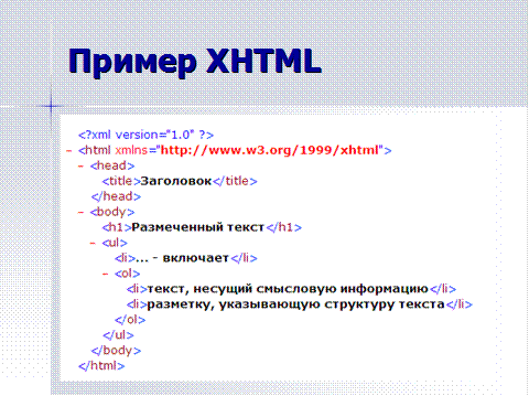 XHTML (Hyper Text Markup Language) – это подмножество языка XML, язык разметки гипертекста. Гипертекст содержит информацию о внутренних взаимосвязях. Примеры гипертекста: