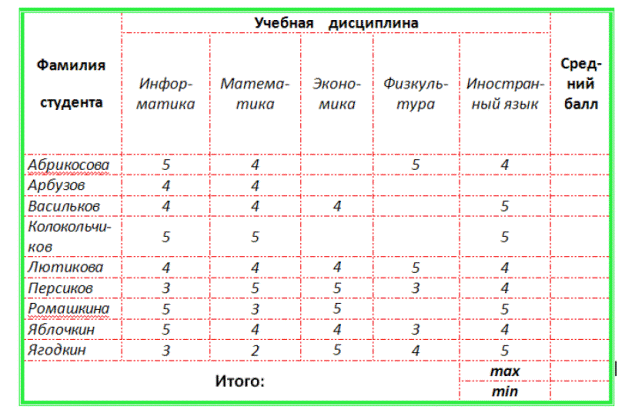 Для созданной таблицы установите: внешние границы – двойные, цвет – зеленый, внутренние границы – пунктирная линия, цвет – красный.