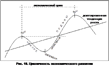 Цикличность экономического развития – непрерывные колебания в рыночной экономике, когда рост производства сменяется спадом, повышение деловой активности – понижением, при этом имеют место взлеты и падения рыночной конъюнктуры (см.рис. 10).