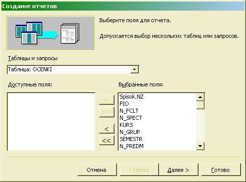 Для этого выбираем раздел Отчеты и режим Создание отчета с помощью Мастера. На первом шаге Мастера выбираем поля главной таблицы базы (SPISOK), которые мы хотим показать в отчете, и все поля дочерней таблицы оценок (OCENKI) (см. рисунок 1).
