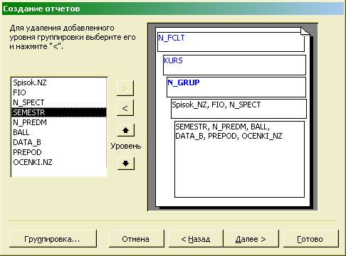 На третьем шаге задаем группировку данных по факультетам, курсам и группам. Более трех уровней группировки Мастер задать не позволяет (см. рисунок 2).