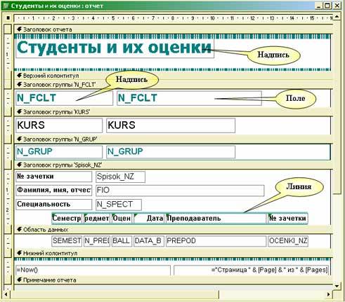 В Конструкторе отчет разбит на отдельные зоны, информация которых может присутствовать в отчете один раз (Заголовок отчета и Примечание отчета), в начале и в конце каждой страницы (Верхний колонтитул и Нижний колонтитул), в начале и в конце каждой группы (Заголовок группы и Примечание группы, групп может быть много) и для каждой записи таблицы (Область данных). Зоны Примечания: более правильно было бы назвать Итоги:, т.к. здесь можно поместить поля общих итогов (сумма, среднее и пр.) для группы или всего отчета.