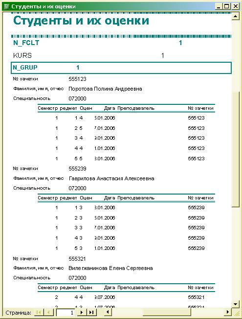 Поставим задачу разработать отчет, в котором показаны оценки всех студентов с группировкой данных по факультетам(специальностям), курсам, группам.